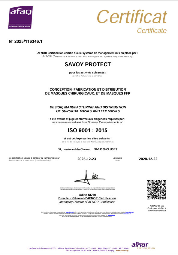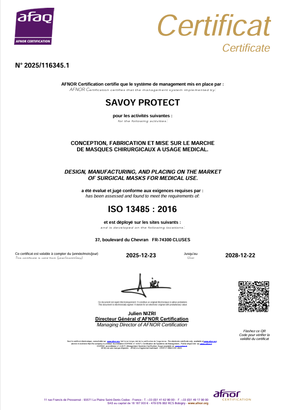 Savoy Protect est une entreprise française implantée à Cluses, en Haute-Savoie, spécialisée dans la conception, la fabrication et la commercialisation de masques FFP2 et masques chirurgicaux.